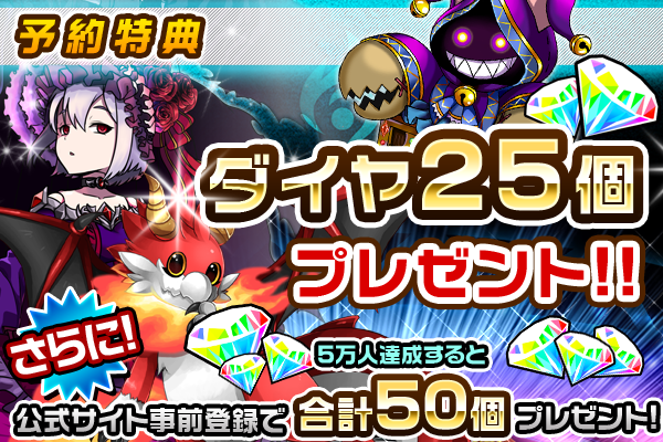 本作では、今冬のリリースに先駆けて、株式会社アドウェイズ(代表取締役社長CEO:岡村 陽久)が提供する事前登録サービス「予約トップ10」にて事前登録を開始いたしました。予約トップ10にてご登録いただいたユーザー様に超豪華特典『ダイヤ25個』をプレゼント。公式サイトにて事前登録済のユーザー様も予約トップ10にて申し込み可能です。公式サイト事前予約特典に加え、予約トップ10の特典もお受取いただけます。「予約トップ10」内特設ページより、お申込みください。