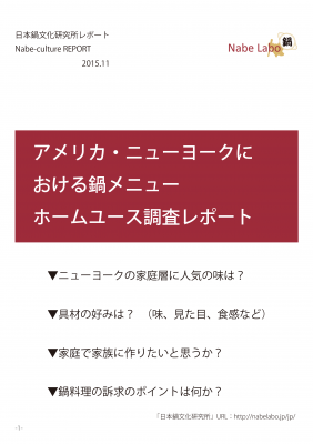 Nabe Labo 日本鍋文化研究所有限責任事業組合が運営する「日本鍋文化研究所」は、2015 年第2弾のレポートとして「アメリカ・ニューヨークに おける鍋メニュー ホームユース調査レポート 」をまとめました。
