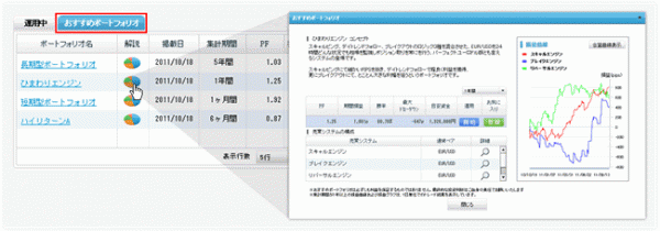 今回追加される「おすすめポートフォリオ」は、売買システムのこれまでの取引傾向※に沿った組み合わせで構成されており「のんびり」タイプ、「積極」タイプ、「トレンド重視」タイプ、「勝率重視」タイプの計4種類となっております。