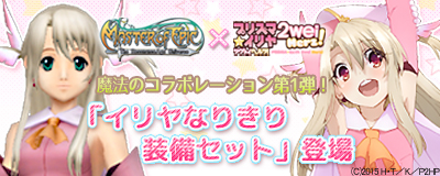 今回はコラボレーション第1弾として、『プリズマ☆イリヤ ツヴァイ ヘルツ!』の主人公「イリヤ」になりきることができる「イリヤなりきり装備セット」など、『プリズマ☆イリヤ ツヴァイ ヘルツ!』の世界をモチーフにしたコラボレーション限定アイテムが『Master of Epic』に登場いたしました。