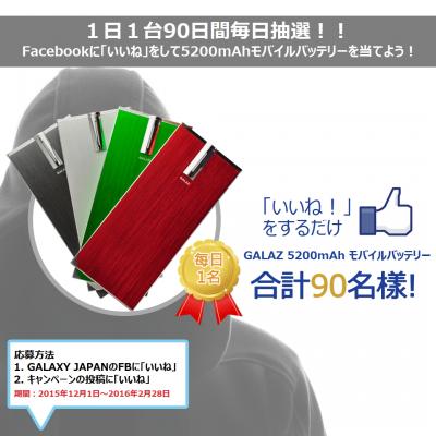 GALAX JAPANのオフィシャルフェイスブックと当該のキャンペーン記事に「いいね」をするだけで、毎日一台「GALAZ 5200mAhモバイルバッテリー」を抽選で一名様、合計90名様にプレゼントします。