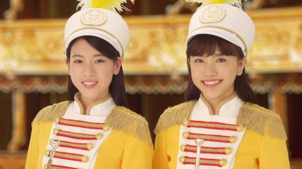 マーチングバンドに扮する松井愛莉さんと三吉彩花さんがラッパを強く吹くと中から「1000店舗達成感謝SALE」の文字が。