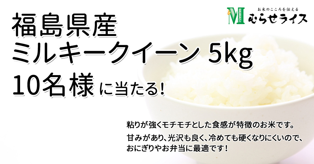 アンケートにお答えいただいた方の中から抽選で10名様にむらせライス「新米 福島県産ミルキークイーン 5kg」をプレゼントいたします!