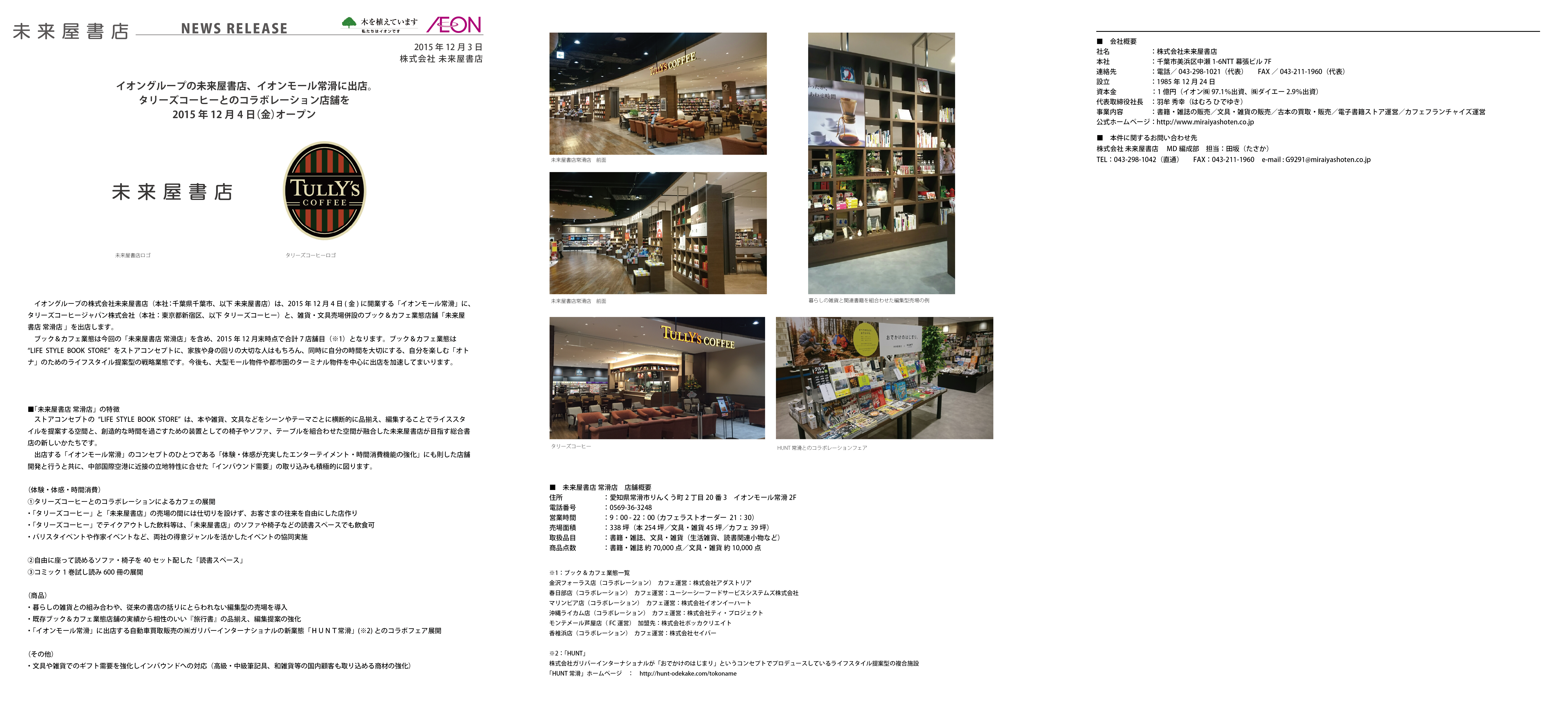 イオングループの株式会社未来屋書店(本社:千葉県千葉市、以下 未来屋書店)は、2015年12月4日( 金) に開業する「イオンモール常滑」に、タリーズコーヒージャパン株式会社(本社:東京都新宿区、以下 タリーズコーヒー)と、雑貨・文具売場併設のブック&カフェ業態店舗「未来屋書店 常滑店」を出店します。