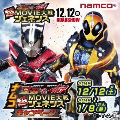 株式会社ナムコ(本社:東京都港区)は、2015年12月12日(土)より全国の映画館で公開される映画「仮面ライダー×仮面ライダー ゴースト&ドライブ 超MOVIE大戦ジェネシス」を記念し、『ナムコ×映画「仮面ライダー×仮面ライダーゴースト&ドライブ 超MOVIE大戦ジェネシス」キャンペーン』を全国41店舗のナムコ直営アミューズメント施設にて2015年12月12日(土)から2016年1月8日(金)の日程で開催いたします。