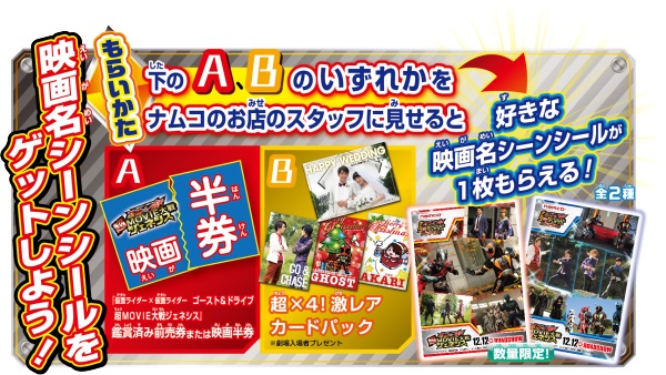 キャンペーン期間中、劇場でもらえる「映画入場者プレゼント」の“超×4!激レアカードパック” または観賞済み映画半券をナムコのお店でスタッフに提示されたお客様に、A6サイズのオリジナル映画名シーンシール(数量限定/全2種)を1枚限定でプレゼントいたします。