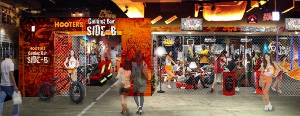『GAMING BAR SIDE-B』は、ナムコのテーマパークやアミューズメント施設の企画運営ノウハウと、HOOTERSのホスピタリティあふれる米国流接客や飲食ノウハウを集結させた新趣向の「インタラクティブスポーツバー」です。