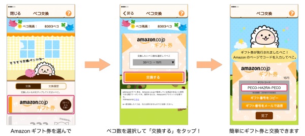 「ペコ交換」は、ペコッター内の活動に応じて獲得できるポイント「ペコ」を貯めると、ギフト券と交換できるサービスです。