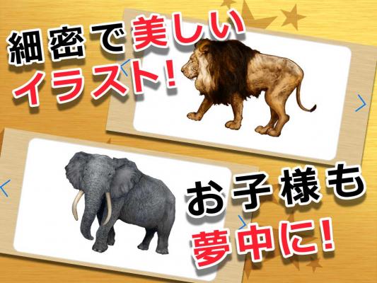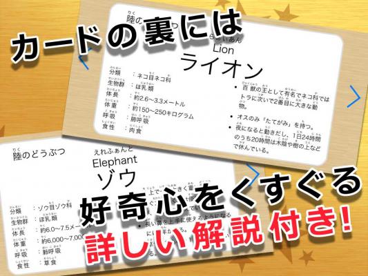 フラッシュカードのように、高速でカードのオモテ面をめくって行き、名前を当てさせることで子どもの右脳を鍛えることもできますし、動物の生物学上の分類や生態など、子どもにはやや難易度の高い説明は、子ども達の探究心や好奇心をくすぐります。