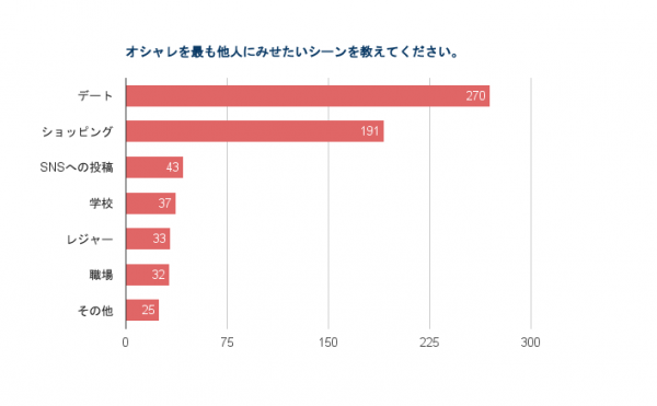 「学校」や「職場」など、毎日通うような日常生活圏は、オシャレの見せ場としてはあまり意識されていないようです。また、フェスや夏場のBBQのような「レジャー」も、意外にも低めの数字となりました。「その他」の回答のなかには、「ライブやコンサート」などの回答がありましたが、いずれも少数派です。