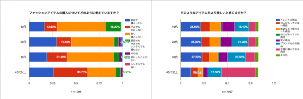 以下の左側のグラフは、「10代」から「40代以上」のユーザーに、ファッションアイテムを購入する際、どのように考えて商品を選んでいるかを聞いた結果です。