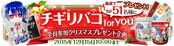 株式会社エレメンツリー(代表取締役:小川 邦弘、所在地:大阪市淀川区)は、2015年12月7日に女性向け恋愛アプリ『あなカレ』内で好評配信中のホラーBLゲーム『チギリバコ』(CV.四ツ谷サイダー、鳩マン軍曹etc)の新作キャラクターグッズが計51名様に当たる「チギリバコfor you ~全員参加クリスマスプレゼント企画~」を開始しました。