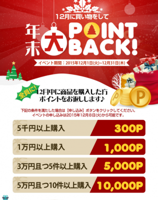 また、年末「大POINTO BACK」キャンペーンとして、2015年12月1日(火)~12月31日(木)の期間に購入された商品金額の総額に応じ、最大10,000ポイントが付与されるイベントも開催中です。