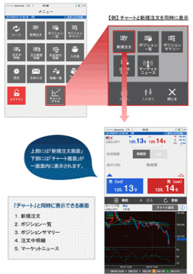 従来のアプリでは、一画面にチャートと併用して見られるものはレートだけでしたが、「チャートプラス」を使えば、「チャートと注文画面」や「チャートとマーケットニュース」等、チャートと併せてご覧いただけるメニューが増えました。