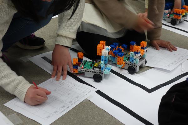 その後、2種類のロボット教材を活用してオリジナルロボット制作し、学習したプログラミング知識を活かして「ステモンチャレンジ! ゴールまでのプログラムを作ろう!」を開催しました。(全120分)