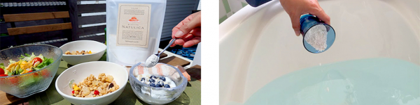 大さじ2杯ほどを湯船に入れてまぜるだけ。体の不要なものを取り除くデトックス効果で、なめらかな肌になるのはもちろん、血行を促し、めぐりのよい体へと整えます。
