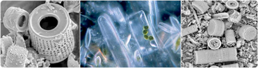 ※電子顕微鏡で見た珪藻土の結晶(左右)生きた珪藻(中央)