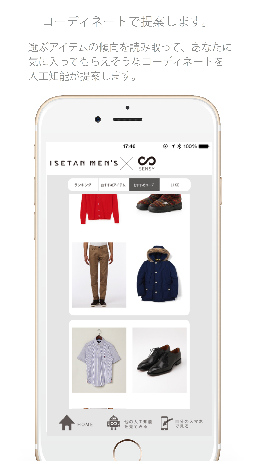 自分の好みを覚えた人工知能が、ISETAN MEN’Sアイテムの中から、単品アイテムやコーディネートを提案してくれます。