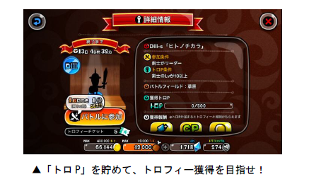 「トロフィーバトル」は、各キャラのトロフィー獲得を目指して、全国のプレイヤーとバトルを行なう