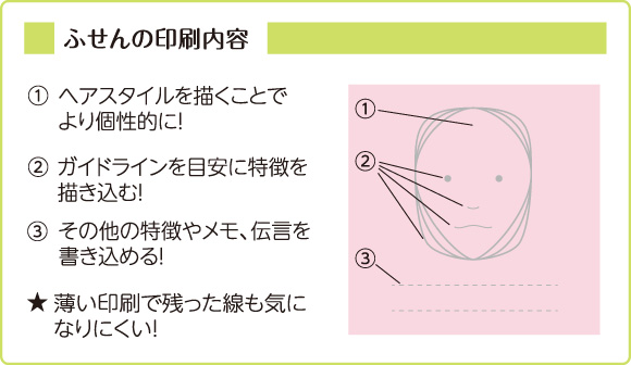 「似顔絵ふせん」とは、付箋紙に似顔絵を描くための輪郭、目、鼻、口の位置を示すガイドラインが予め印刷され、簡単に似顔絵が描けるよう工夫された付箋紙です。