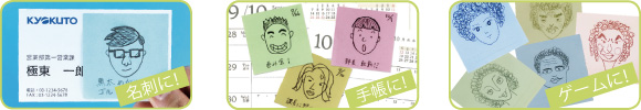 日々のお仕事に、プライベートに、ちょっとしたメモを渡す際に、その人の顔やご自身の顔、ご家族、好きなアーティストなどなど思いつくままにお描き下さい。絵の上手い、下手ではなく、心のこもった似顔絵が相手も自分も和ませてくれます。また工夫次第でお仕事やゲームのツールとしてもお使いいただけます。
