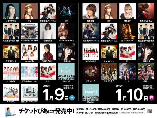 1月10日(日): 松本梨香/榊原ゆい/YOFFY(サイキックラバー)/彩音/デスラビッツ/おさむらいさん/シアターOM/ViVi/秘密結社フローリス/私立應南学院高等部/SAKAE GIRLS/BSJ/佐倉ユキ/Movi’n!/ゾンビーズ/*ココロモヨヲ* 他