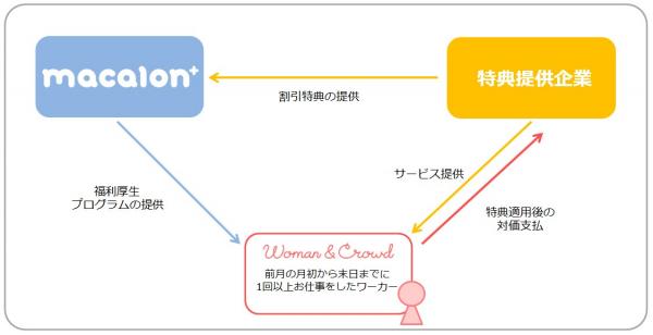 この取り組みは、企業に勤める社員向けに従来は有料で展開している「macalon+」を、クラウドソーシングのワーカーに無料で提供する(※1)というものです。「Woman&Crowd」に登録するすべてのワーカーは企業に勤める社員と同等の特典ラインナップを利用することができ、女性にとってクラウドソーシングという働き方が、新しいキャリアの選択肢としてより浸透することを狙いとしています。