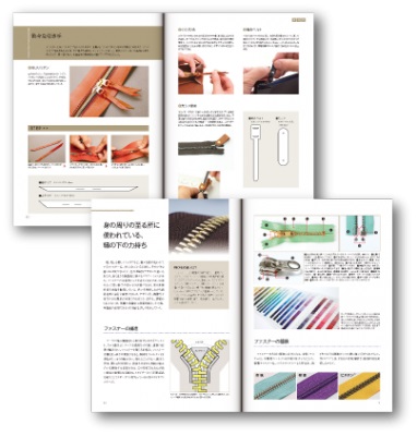 ファスナーの構造やバリエーションを紹介する「ファスナーの基礎」、型紙と作り方まで掲載している「いろいろな引き手」、ファスナー作品に欠かせない「ファスナー加工のコツ」などを掲載しています。