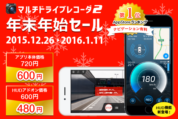 株式会社トライテックは、株式会社 恭和と共同開発・販売しているiPhone用多機能ドライブレコーダーアプリ「マルチドライブレコーダ2」の年末年始セールを、2015年12月26日(土)から2016年1月11日(月)まで開催致します。 本体価格720円を600円、新しいアドオン「HUDモード」通常価格600円を480円でご提供致します。年末年始の安全運転、交通事故の抑制のため、この機会にドライブレコーダーを活用してみてはいかがでしょうか。
