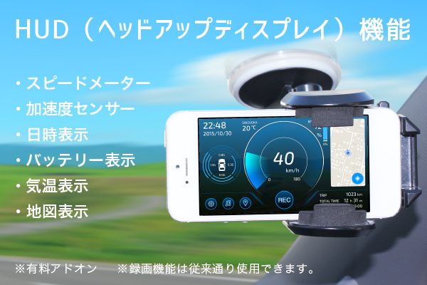 !通常のHUDのようにガラスなどに映して使用するものではありません。録画画面の上に透かして走行情報を表示します。