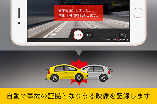 デバイスに搭載されているG加速度センサーを利用した「自動録画」機能は、急ブレーキや衝突の衝撃を感知すると自動で録画を開始、決定的瞬間を逃さず記録します。