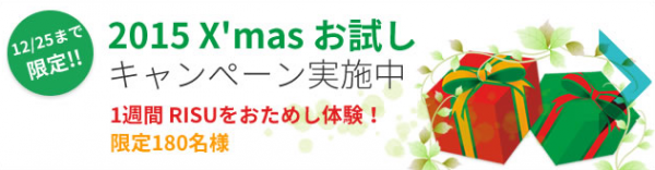 また、RISUに興味を持っておられる潜在的なお客様に対しては、クリスマスから年末にかけてRISU算数を試すことができるよう、RISU X'mas 特別キャンペーンを実施します。お申込みの方のご自宅でゆっくりRISUを体験し、万一ご満足いただけなければ、返品することができるものです。申込期日12月25日。
