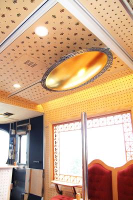 ⇒本金箔の空間は運気が上昇するといわれ、縁起のよい空間の中で、鉄道の旅をお楽しみいただけます。
