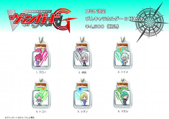 「カードファイト!! ヴァンガードG」より、透明なプレートにプリントされた手のひらサイズのキーホルダー「びんきゃらホルダー」発売決定です。ラインナップは、「クロノ」「伊吹」「ハイメ」「トコハ」「シオン」「マモル」の6種。12月29日~31日に開催されるコミックマーケット89にて、限定セットとして先行販売されます。本セットは西4階 No.322のコウブツヤブース『びんきゃらSHOP』で取扱いいたします!※セットでの販売はコミケ限定となります。イベント終了後はそれぞれ単独での販売となります。