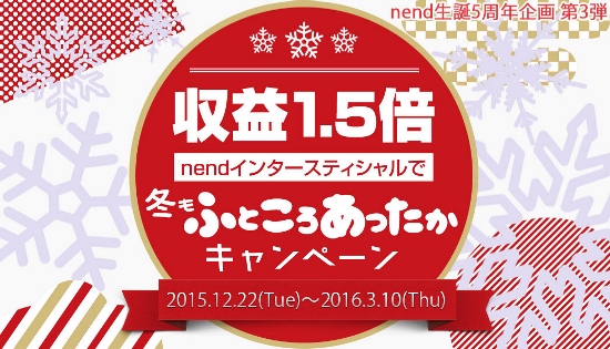 インターネット広告事業を展開する株式会社ファンコミュニケーションズ(本社:東京都渋谷区、代表取締役社長:柳澤安慶 東京証券取引所市場第一部:2461)が運営する、国内最大級のスマートフォン向け運用型アドネットワーク「nend(ネンド)」< http://nend.net/ >は、サービス開始5周年を記念して、また日頃よりご愛顧いただいておりますメディアパートナー様への感謝の気持ちを込めて、2015年12月22日(火)より『収益1.5倍!nendインタースティシャルで冬もふところあったかキャンペーン』を実施いたします。