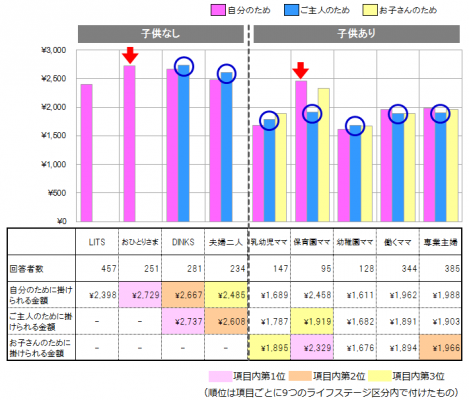 ■ 【自分のために掛けられる金額】が最も高いのは『おひとりさま』(2,729円/月)、次いで『DINKS』(2,667円/月)となっていました。また、子供がいる人の中では、『保育園ママ』(2,458円/月)が自分の為にお金を掛けているようです。