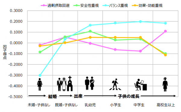 ■ 「食に関する意識」を探るため、調査した意識項目を使用して因子分析を実施し、以下の4つの因子を抽出し、結婚~出産~子供の成長のライフステージ別に比較しました。