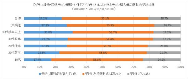 過去に公開されてきた調査では、「眼科を受診していない」割合の多さに焦点を当ててきており、また、カラコンは特に度なしの若年層のユーザーにおいて眼科の受診率が低い結果となっておりましたので、度なしのみの購入者/度ありを含む購入者別、世代別、そして、世代別と度なしのみの購入者/度ありを含む購入者別をかけあわせた分類による眼科の受診状況も集計しました。以下、すべて集計期間内におけるデータですが、その旨は省略します。