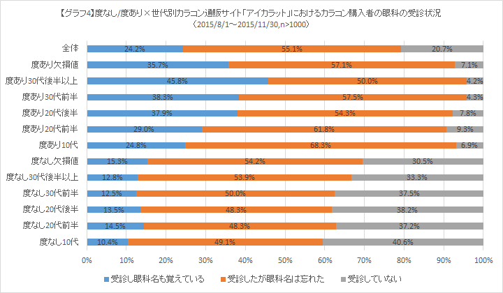 上述の通り度なし/度ありの違いによる眼科の受診状況が大きく異なることを念頭に置くと、インターネット経由の購入者は度ありユーザー比率が高いため今回発表したデータの方が眼科の受診率が高かったのではないかと考えています。