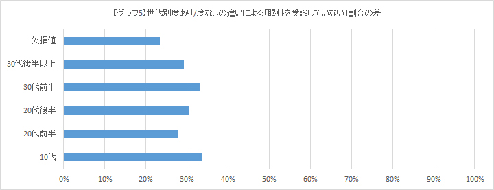 次に、世代別に「眼科を受診していない」割合をみると、10代の約24%をピークに、20代では約21%、30代以上では約17%、と世代が上がるにつれて「眼科を受診してない」割合が下がっていく傾向にあり、10代は30代後半よりも約7%程度眼科を受診してない割合が高くなっていました。(グラフ3)