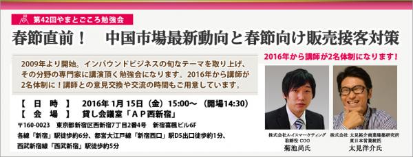 日本最大のインバウンド(訪日外国人観光)業界向けBtoBポータルサイト「やまとごころ.jp」(http://www.yamatogokoro.jp/)を運営する株式会社やまとごころ(代表取締役:村山慶輔、本社:東京都新宿区、以下 やまとごころ)は、2016年1月15日(金)に「春節直前!中国市場最新動向と春節向け販売接客対策」をテーマにした「第42回やまとごころ勉強会」を開催します。