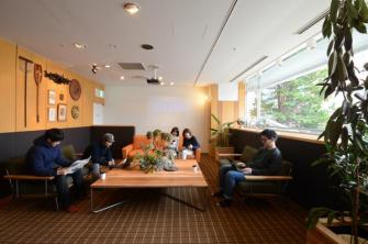 奥のスペースに配置したソファーエリアではプロジェクターで函館の観光案内を上映していますので、チェックイン前や後、函館観光にお出かけの前に飲み物を片手に読書やおしゃべりを楽しんでいただけます。