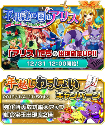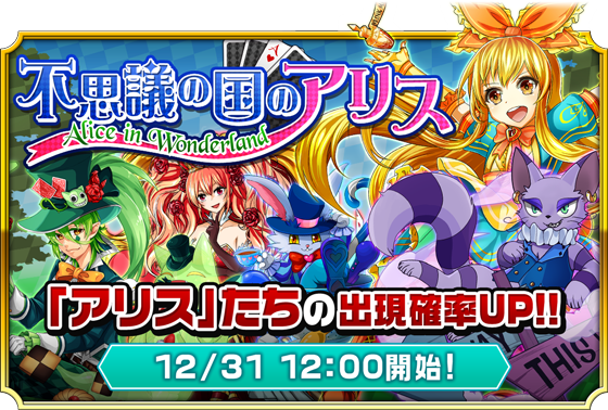 12月31日(木)よりガチャに新作のキャラクターが5体追加されます。新たに追加されたキャラクターは同時に開催される「不思議の国のアリス」イベントを有利に進めることが出来るキャラクターです。2016年1月14日(日)11:59まで通常より出現率をアップいたしますので是非この機会に獲得しクエストを有利に進め、お楽しみください。