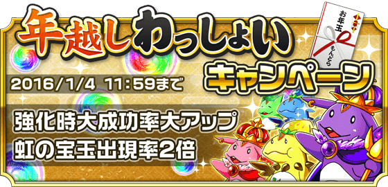 2015年12月29日(火)より開始される本イベントでは曜日毎のクエストに獲得できる『虹の宝玉(注1)』のドロップ率が2倍になります。また、強化時の大成功率が通常時よりアップいたします。是非この機会に虹の宝玉を獲得し、自分のモンスターを最強モンスターに育ててお楽しみください。