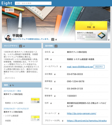 Eight上に個人のプロフィールページを作成できるようになりました。名刺情報の基本項目(会社名、部署、メールアドレス、電話番号、住所)に加えて、仕事内容やキャリアサマリ、職歴、生年月日・性別、フェイスブックへのリンクをプロフィールとして登録できます。プロフィールは公開できますのでメールの署名などに入れてオンライン名刺として利用可能です。プロフィールページのURLは、ユーザ自身で文字列を設定できます。