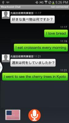 メガネ型ウェアラブルデバイスを装着した2人が異なる言語で発話した内容を相手の言語に翻訳して再生します。再生される音声は相手のデバイスの画面でテキストでも表示され、その逆翻訳が発話者のデバイス上に表示されます。複数のウェアラブル端末に対応しており、また相手がスマートフォンでも汎用的に動作するため、デバイスの普及に依存しない普及性を持っています。