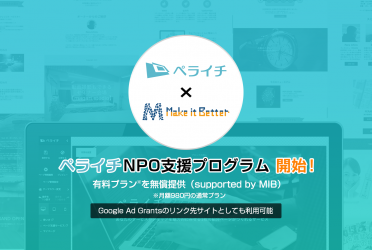 Webサービス開発運営を行う、株式会社ホットスタートアップ(所在地:東京都渋谷区、代表取締役:橋田一秀)は、同社が提供する誰でも・カンタンに・素早くサービスやショップを魅力的にみせる 1枚のスマホ対応の紹介ページがつくれるサービス「ペライチ」の月額980円のプランを、非営利団体(特定非営利活動法人、公益財団・社団法人、社会福祉法人) に対して無償で提供する『NPO支援プログラム』を2016年1月12日に開始いたしました。同プログラムの NPO の受付窓口は、NPO 法人 Make it Better が担当しています。また本プログラムは、Google が対象団体へ 1か月あたり 10,000ドル分の AdWords 広告費を助成する Google Ad Grants (https://www.google.co.jp/intl/ja/grants/)のリンク先サイトとしてもご活用いただけます。Google Ad Grants は Google for Nonprofits | 非営利団体向けプログラム内で提供されており、活用のためには「テックスープ・ジャパン(運営:日本NPOセンター)」(http://www.techsoupjapan.org)への登録が必要です。