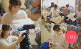 「いってらっしゃい」編では、洋服が溢れる部屋に座る田中里奈さんが、手書きのメッセージカードを添えて、「フリル(FRIL)」で出品したチェックのワンピースを梱包する様子を見せています。