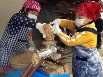 味噌作り体験の様子と「元気ならぎの」のみなさん
