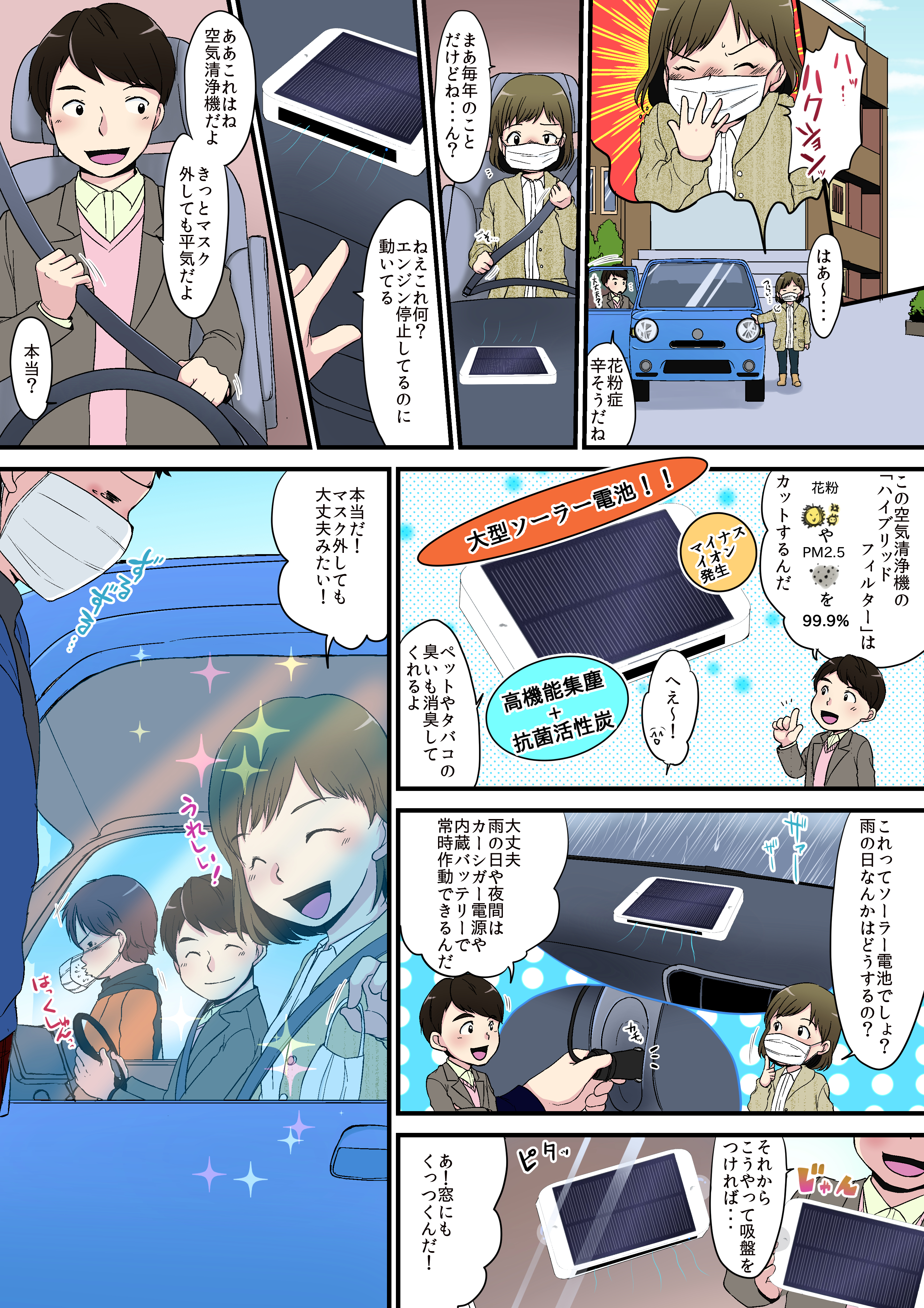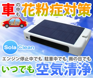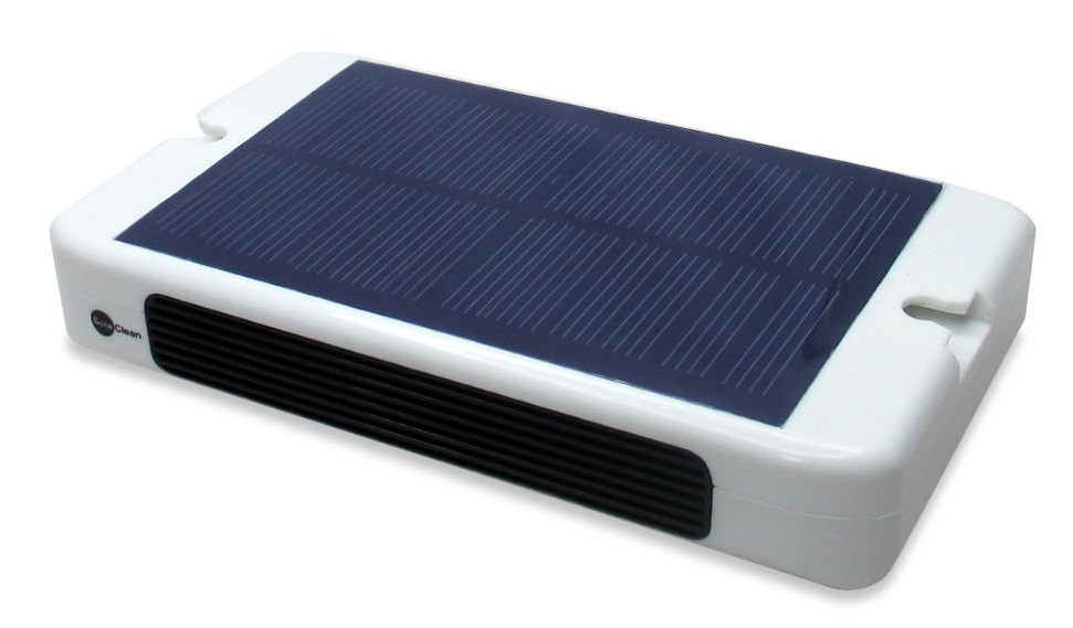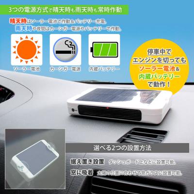 大型ソーラ^パネル,充電電池、カーシガーの3電源方式でエンジン停止中も常時空気を清浄。